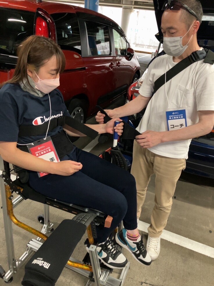 現在でも定期的に入院して血漿交換という免疫治療を受ける必要はありますが、周囲のサポートで生活自体は落ち着いて送れるようになり、この身体であっても何か目標をもって打ち込めるものはないか、と漠然と考え始めていた頃にパラスポーツへの参加を勧められ、様々なパラスポーツを体験しました。座ること自体が安定して保てない状態のため、自分にできる競技、自分にあった競技をなかなか見つけることができませんでした。パラスポーツをやりたいと思っても、自分に合うものが見つからないもどかしい時期がありましたが、今では「座位投てき」という、自分の特性にあった競技に出会うことができました。 実はもともと、学生時代に陸上投擲競技をやっていたのですが、車いすとなった当初は、この身体の状態で重い円盤を投げることなどそもそもできないものと思い込んでいました。パラ競技は障害の種類や特性に応じて参加機会が得られる工夫として「クラス分け」があり、私は現在F52という座位のクラスで円盤投げをメインに競技参加をしています。健常の円盤投げは全身を使った回転動作で円盤を遠くに投げますが、私の競技クラスは投てき台という特殊な競技用台座に座った状態で円盤を投げます。但し、同じクラスの選手でも首のコントロールや座位姿勢自体の安定性は保てる選手が多い中で、私の場合には上半身を立てた状態での座位姿勢保持が困難ですので、特殊な投擲台を試作してもらった上で競技に参加しています。