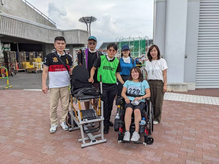 今日は雨予報でしたが幸い競技時には良い天候に恵まれ、10m41cmのとても良い投てきができました。この記録は自己ベストの11m42cmには及ばないもののとても手ごたえのある記録です。というのも、鬼谷さんは1カ月周期で血液浄化という免疫治療を行う必要があるのですが、今回はこの治療サイクルの中で少々厳しいタイミングでの大会参加だったためです。血液浄化から時間が経つと、全身の力の入りにくさ、首や頭の姿勢を保つことの難しさ、まぶたが重くなり下がってきてしまう(眼瞼下垂)など、競技を行う上での難しさが出てきます。治療のサイクルを考慮しての競技生活には、時期に応じた練習量や目的の調整が必要で、体調面に留意しながら生活と練習のバランスを保つことが重要になります。今回大会に向けて、ここ最近の練習では記録そのものよりも投てき台のセッティング、フォームを定着に優先度を置いて取り組んできました。