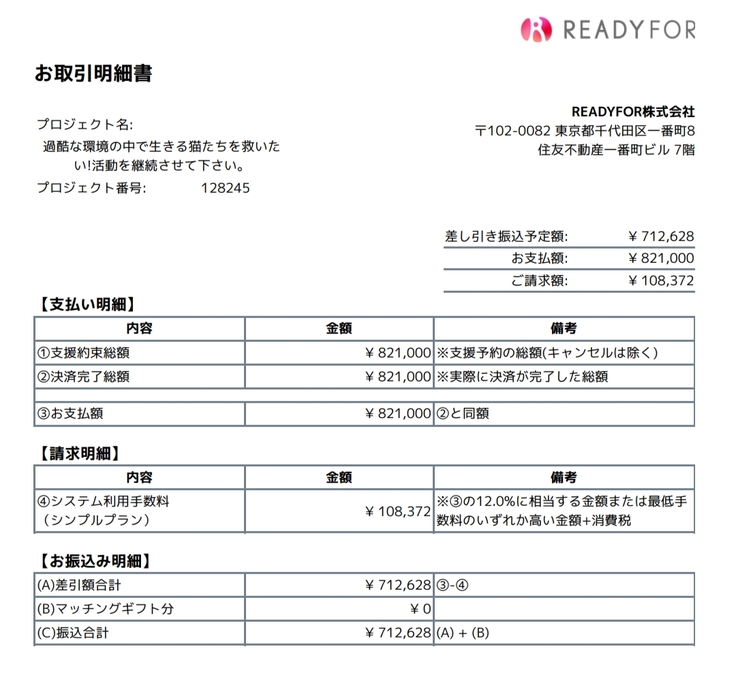 皆様からご支援いただきました支援金が、Ready for さんより12月8日入金となりました。