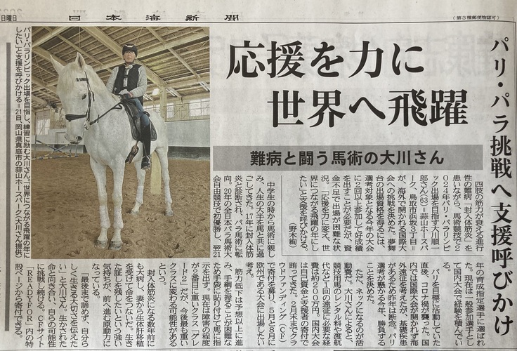 ある日のこと、大川さんがお一人で当社に来社されました。一軒一軒ご自身で訪問し、ご自身のパラ馬術競技の活動についてお話される真剣なお姿に感銘をうけました。進行する病気と闘いながら、現実をあるがままに受け止め、まさに「決してあきらめることなく目標や夢に向かっていくこと」「希望を持ち続けながら自分らしく生きること」を実践されているお姿は、未来の子どもたち、障がいを持たれる方への希望をあたえてくれます。大川さんへの応援は、私達にとって自分への応援、地域への応援です。皆で夢の実現に向けて、一歩ずつ前進しましょう。