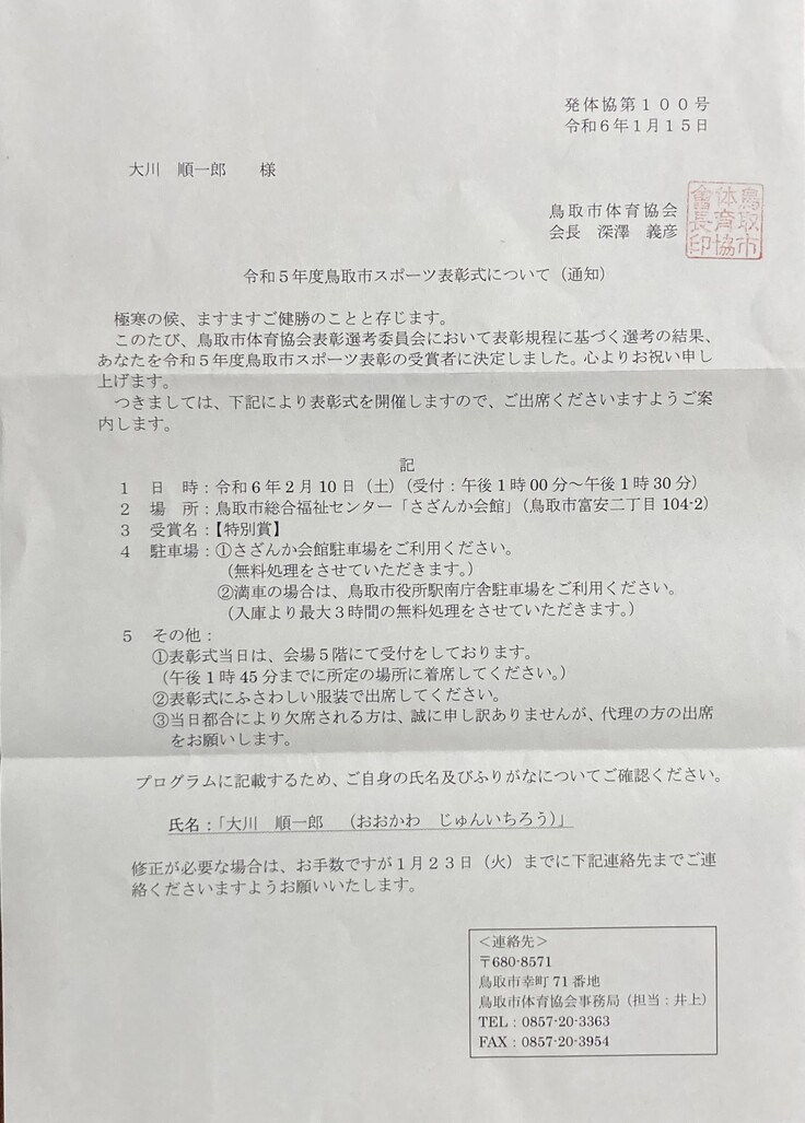 鳥取県障がい者スポーツ協会さまが鳥取市に推薦をしてくださり、このたび、令和5年度 鳥取市スポーツ表彰の受賞者の決定通知をいただきました。