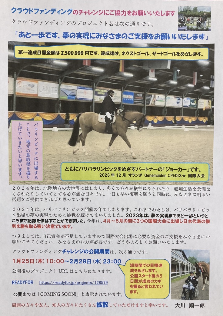 わたしは、パラ馬術競技にチャレンジしながら鳥取市や各地域の公民館、小学校などで「どんな状況にあっても、自分の目標や夢に向かってあきらめないでがんばりましょう。」と講演をさせていただいてきました。