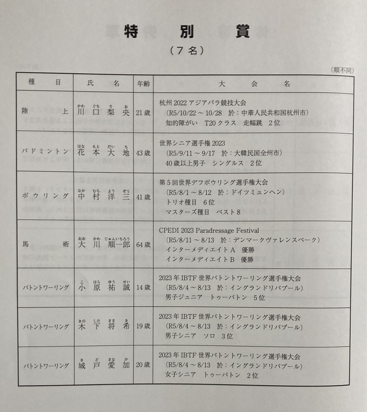 特別賞は、オリンピックに出場した選手、あるいは国際大会で優秀な成績を収めた選手に贈られる賞のようです。