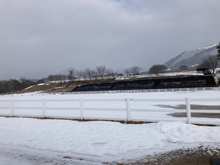 外の馬場には雪が残る中 童夢と気持ちよくトレーニングをすることができました