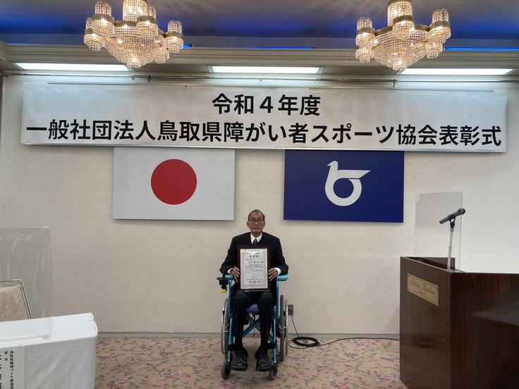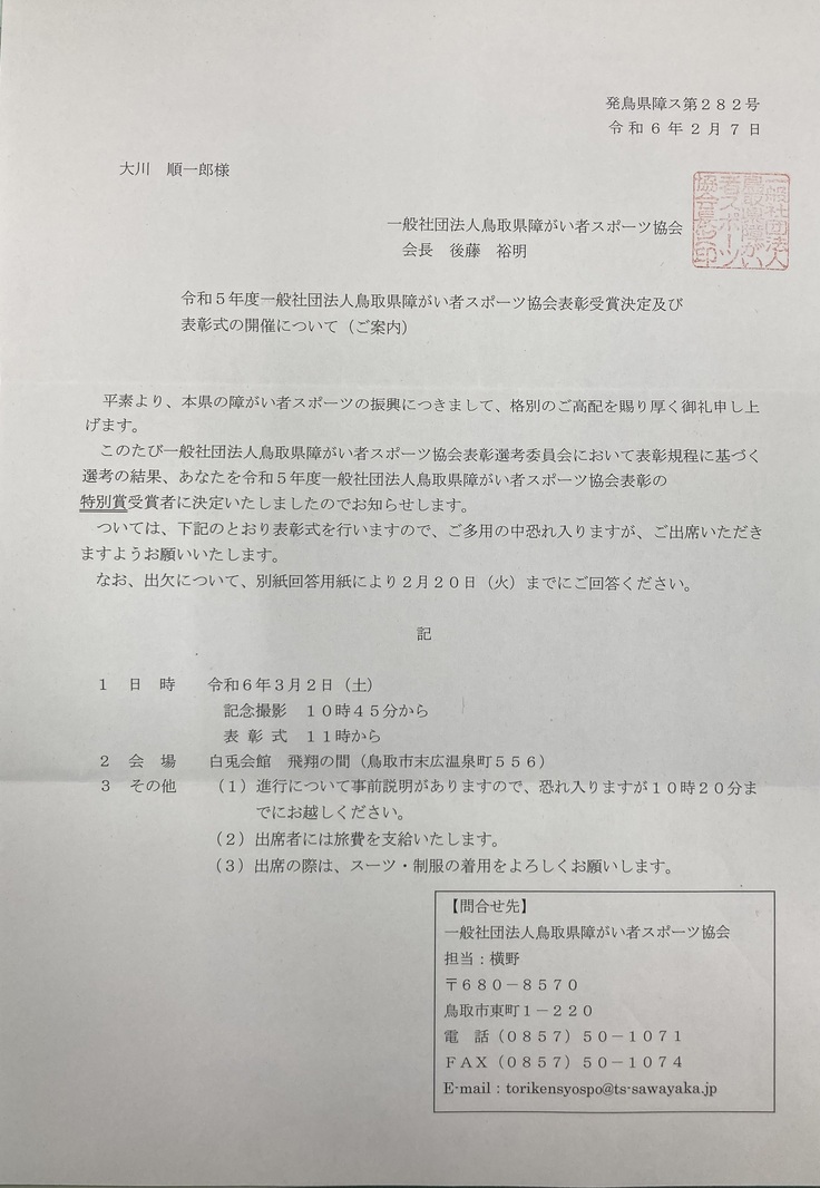 先週、鳥取市体育協会さまよりスポーツ表彰で特別賞を受賞したばかりですが、このたび、鳥取県障がい者スポーツ協会さまより特別賞受賞のご連絡をいただきました。