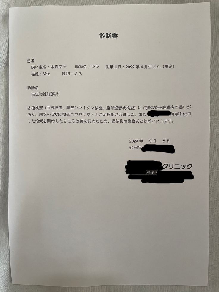 8月31日からFIPの国内未承認の投薬治療を開始しました