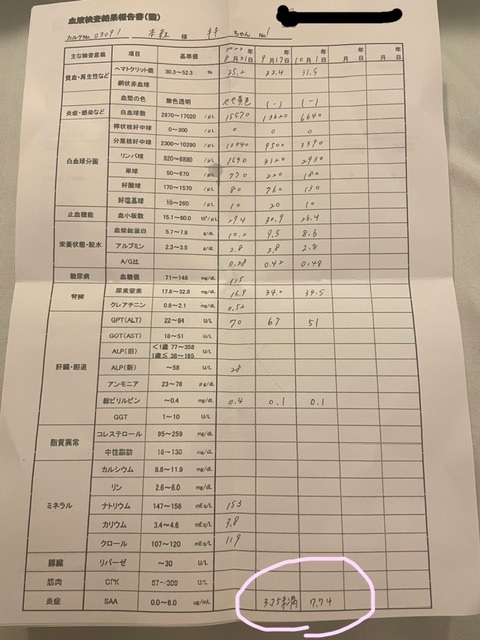 採血は炎症数値のSAAがまた少し上がってましたが、FIP によるものかははっきりしないとのこと。