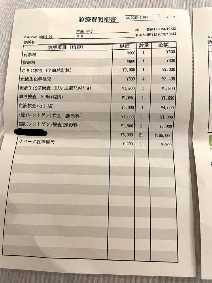レントゲンと採血をしました。レントゲンでは胸水も認めませんでした。やっぱり右の上葉の肺は機能してないみたいで白くなってます。