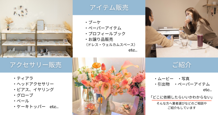 当店ではみなさんが近い時期に結婚されることもあり、店員に悩み相談出来るだけでなく周りの人と情報交換したり、共感したり、新しいつながりが出来たりと結婚式準備の不安を解消するだけはない、新たな価値を生み出す場所にもなっているのです。