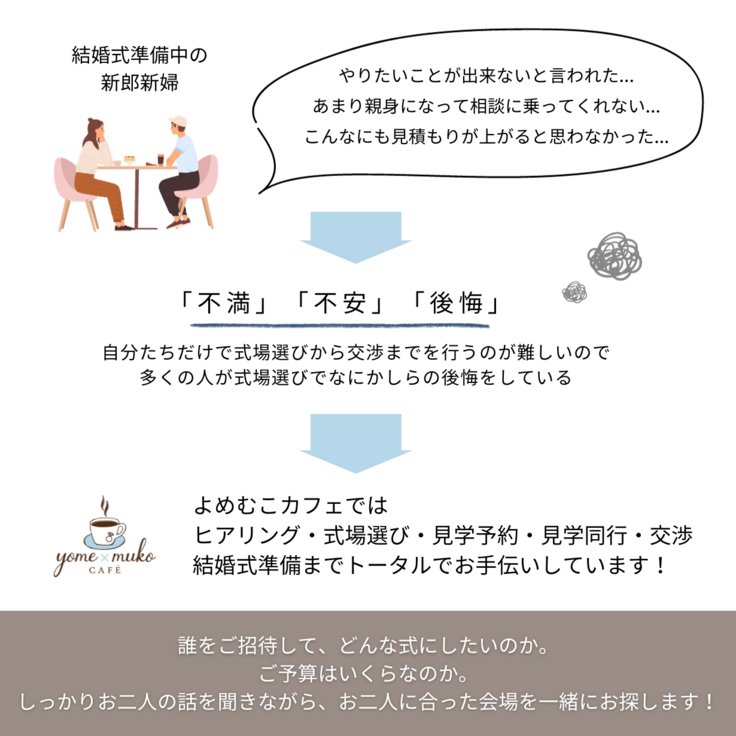 よめむこカフェではたくさんの新郎新婦さんのリアルな声を聞きますが、このように式場選びで何かしらの後悔をされている方を見るたびに胸が苦しくなります。