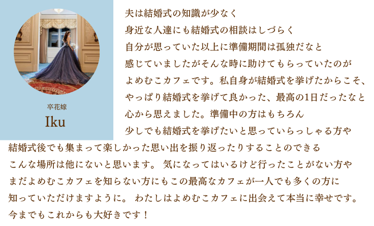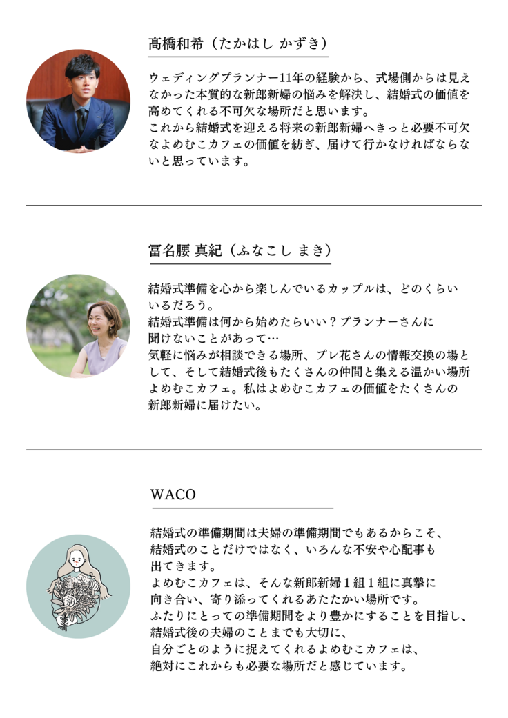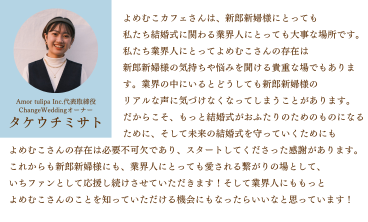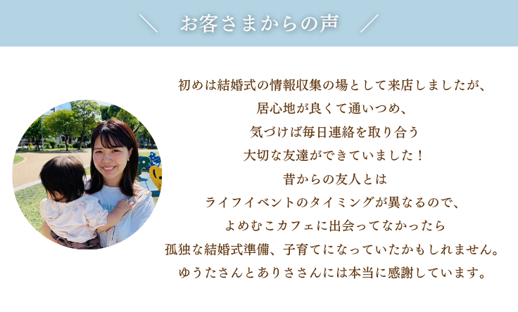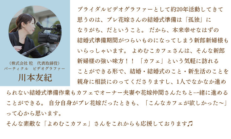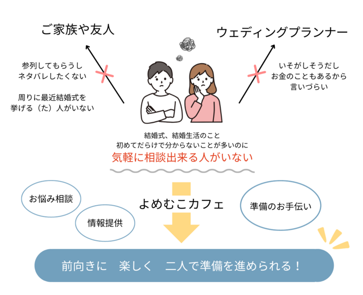 そんな新郎新婦によりそえる場所をつくりたいとオープンしたのがよめむこカフェです。