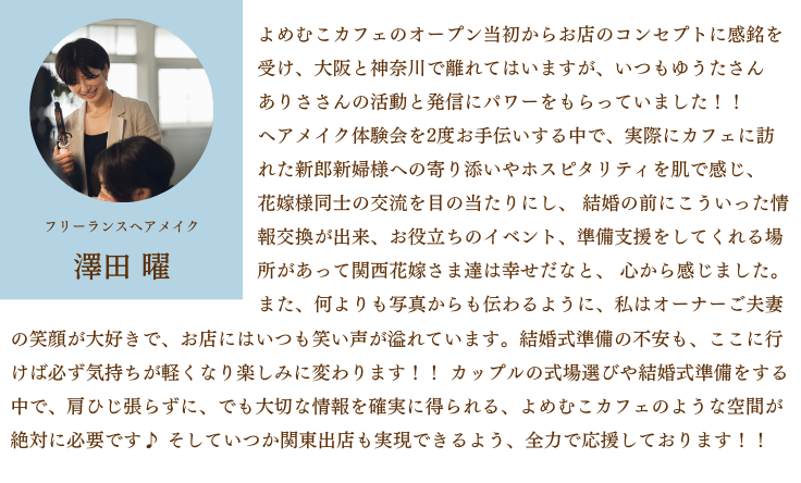 以下ではよめむこカフェでのサービスの一部をご紹介させていただきます。