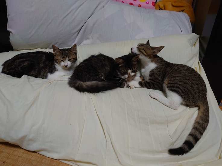 今、4匹の猫たちは外の過酷な環境から保護され、食べること、寝る場所に不安なく過ごしています。