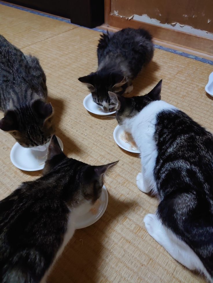 今、4匹の猫たちは外の過酷な環境から保護され、食べること、寝る場所に不安なく過ごしています。