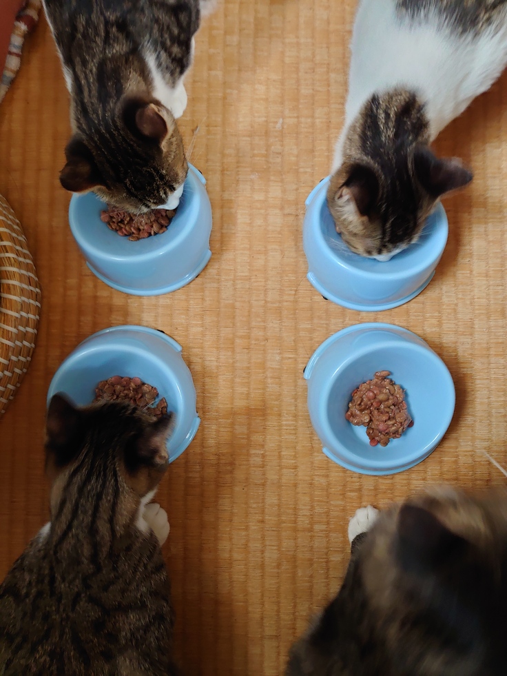 今、4匹の猫たちは外の過酷な環境から保護され、食べること、寝る場所に不安なく過ごしています。