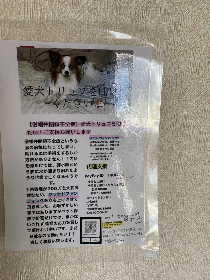 本日は病院の日ですが、次回手術予定の病院までの間のお薬が切れるため、興奮してしまうトリュフはお留守番で、お薬だけいただき、病気のワンちゃんもたくさんいらっしゃるので、凄く迷ったのですがチラシを快く2枚も貼ってくださいました🙇♀️💦