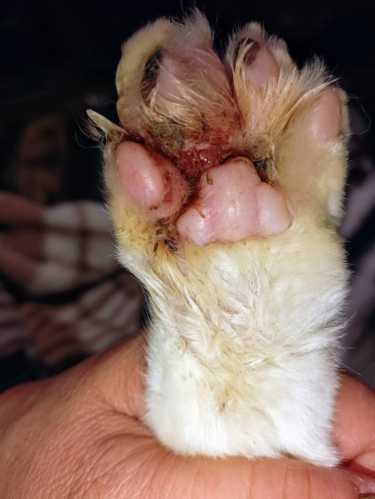 保護猫の龍のすけ君の神経がない右足が凄い事になっていました😱ゴミかと思い、剥がしたらカサブタでした