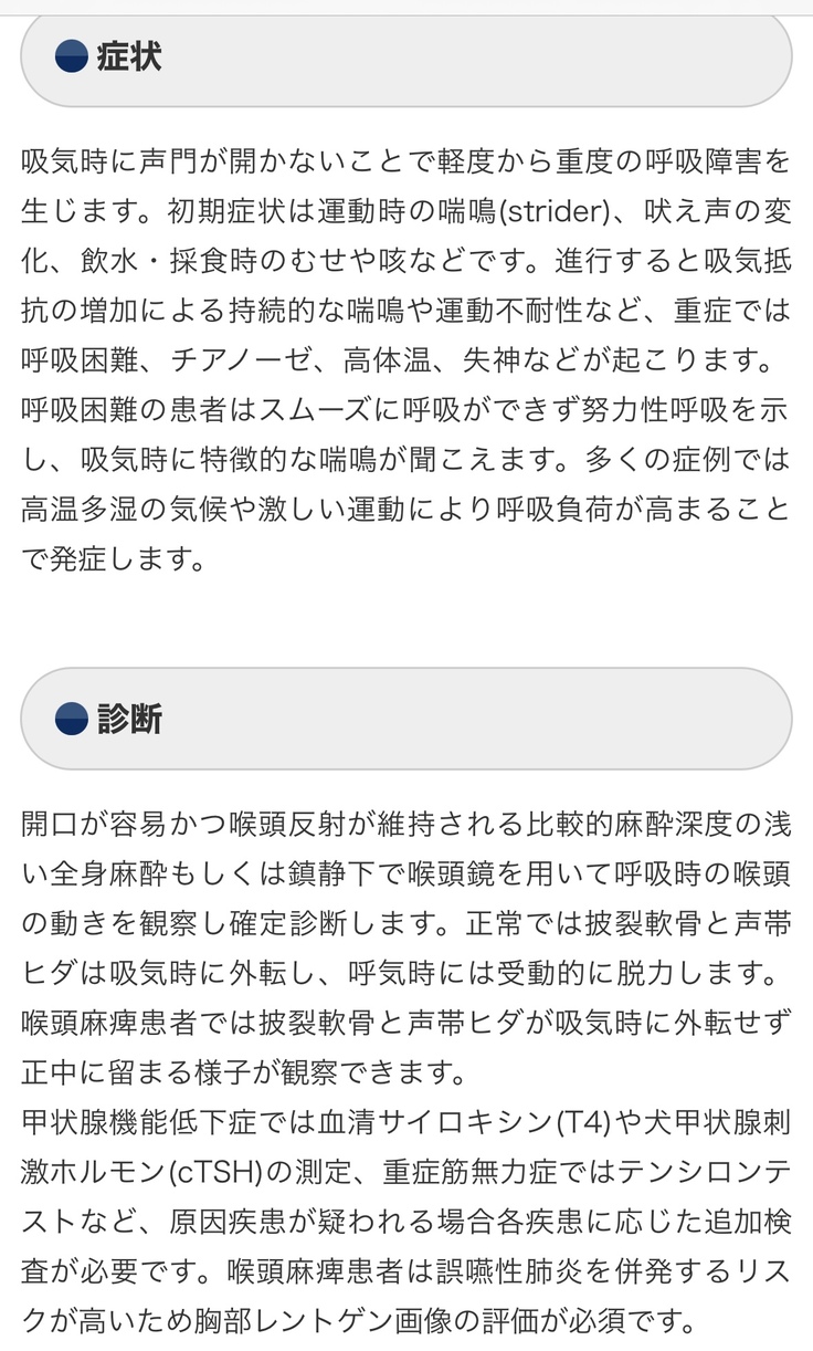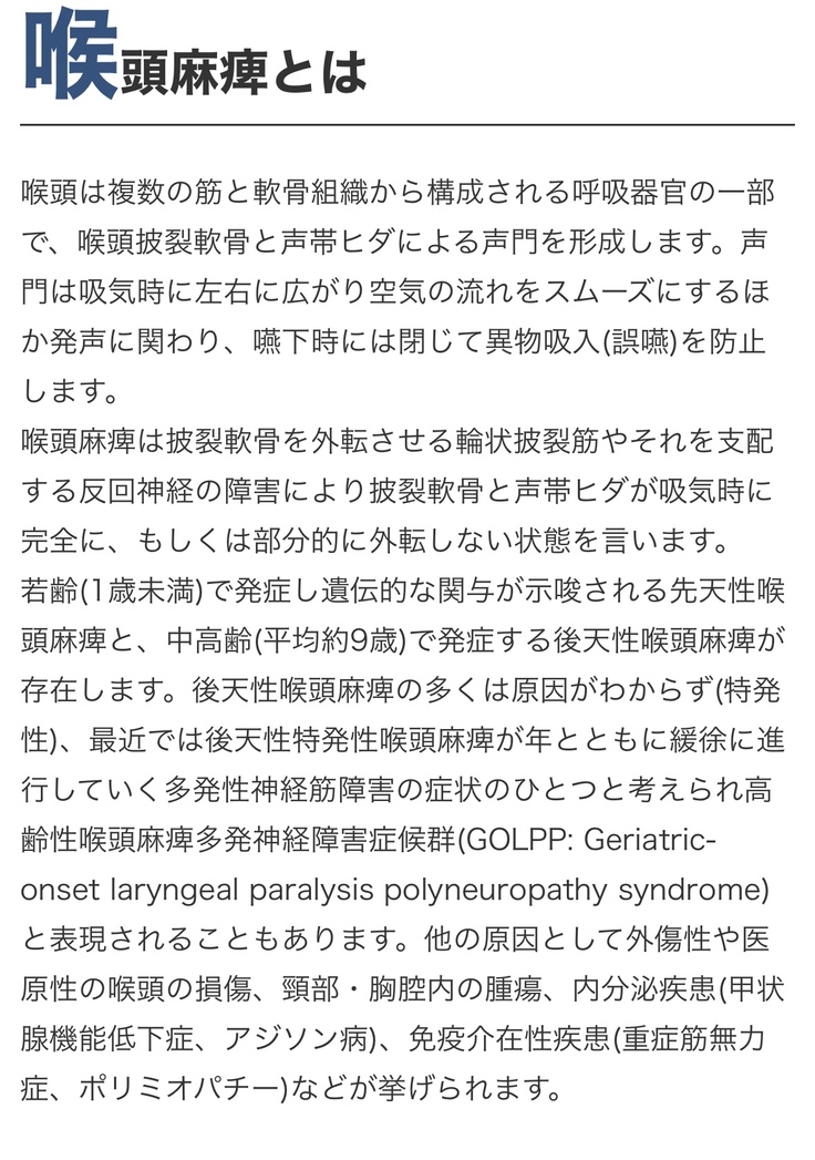 気管虚脱からの喉頭麻痺は実に3%の発症しか報告がないそうです。その3%に入ってしまいました。しかし、治してくれる先生がいるので良かったです。