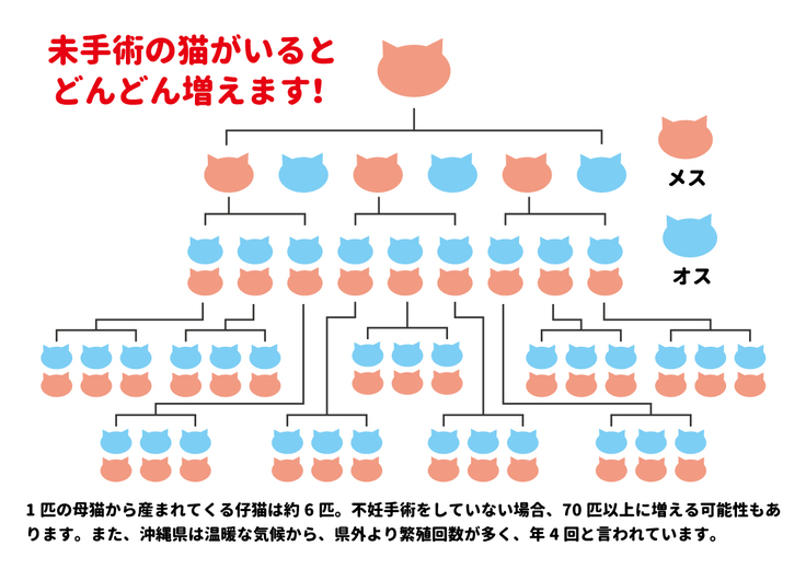 沖縄県では温暖な気候も影響し街中では、飼い主のいない猫(ノラ猫)が年に3~4回出産し年々増え続け社会問題となっています。