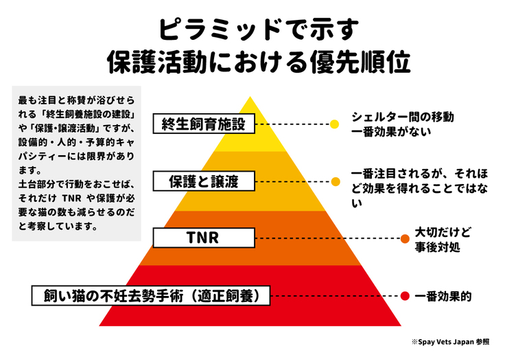 この図からも保護や譲渡、またシェルターよりもTNR活動が不幸な猫を減少させる有効な手立てである事がおわかりかと思います。