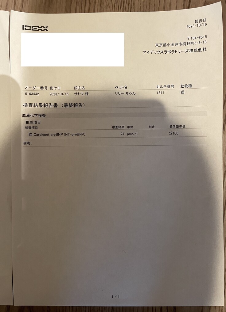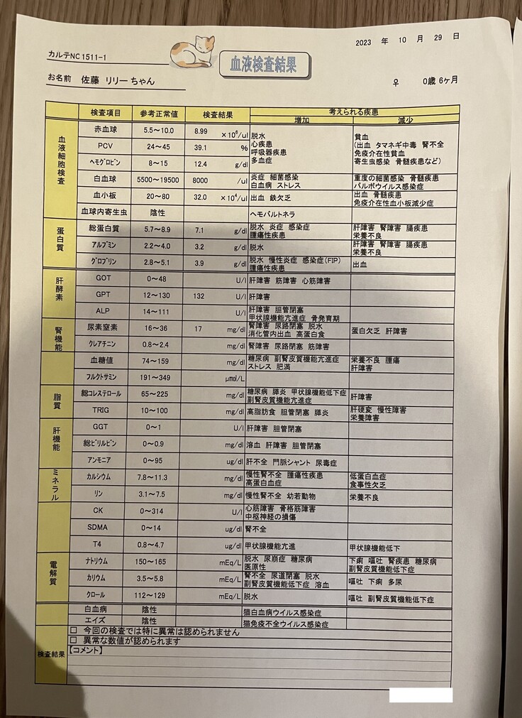 FIP治療薬で肝臓の数値がまだ高いですが、ほかは問題なく正常値でした!!