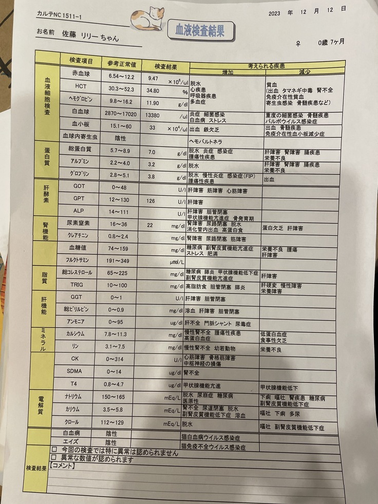 FIPの症状としてでるが、投薬期間中に再発するとは考えずらいため今後の経過観察で様子を観察し、次回の健診は1か月後ではなくまた2週間後に行くこととなりました。