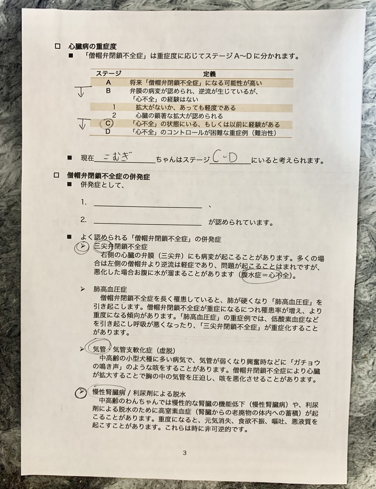 循環器専門の動物病院ではこむぎの重症度はステージCでいつ肺水腫、心不全になってもおかしくない状況だと言われました。