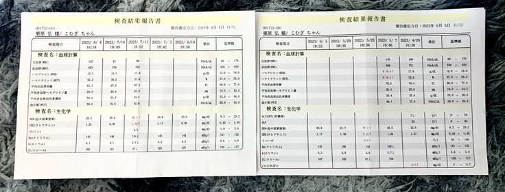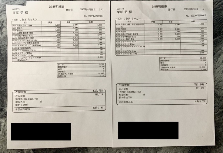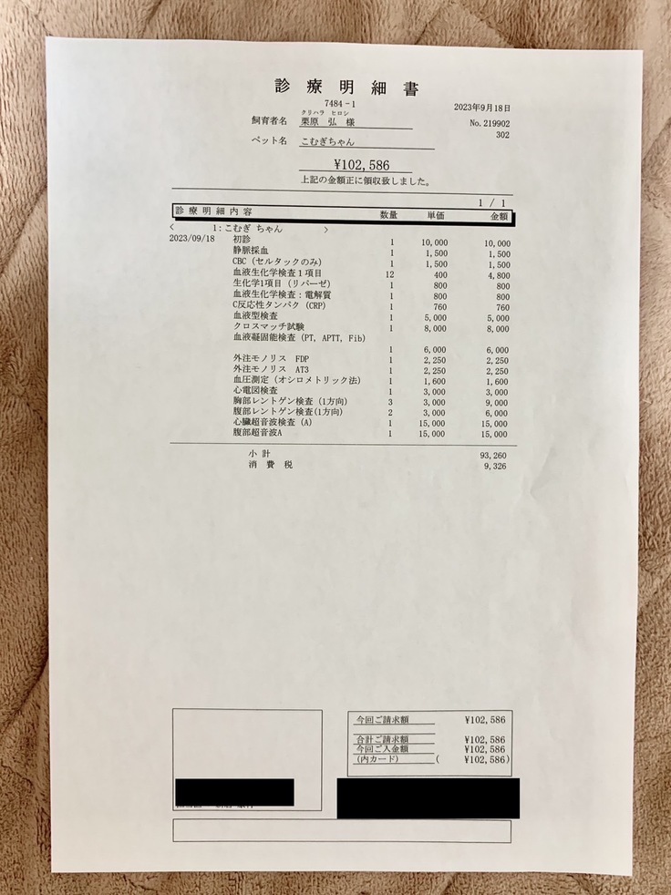 こむぎの手術費用+入院費用+検査費用+お薬代などを合わせると概ね200万円〜220万円ほどかかると言われております。