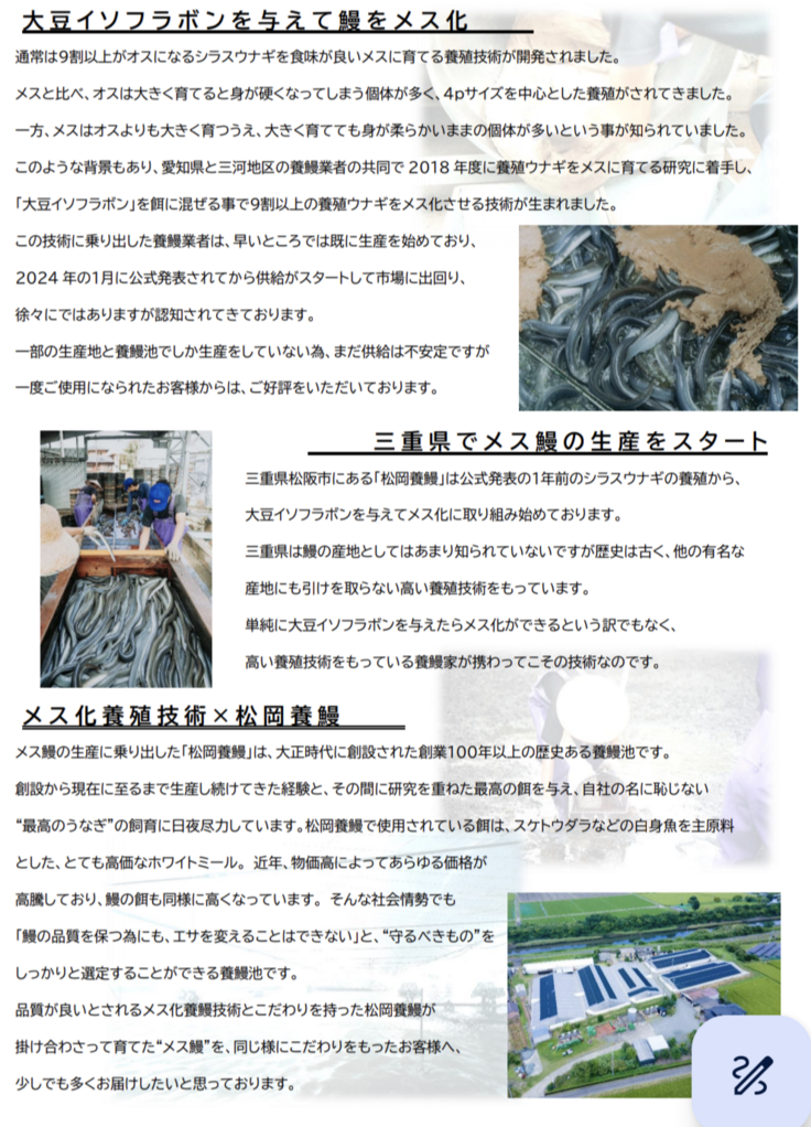 当店使用のうなぎは、三重県のブランド養殖うなぎ❝天水うなぎなでしこ❞を富士山の名水で約1週間寝かす事で、余分な脂が抜け天然うなぎの香りが蘇ります。