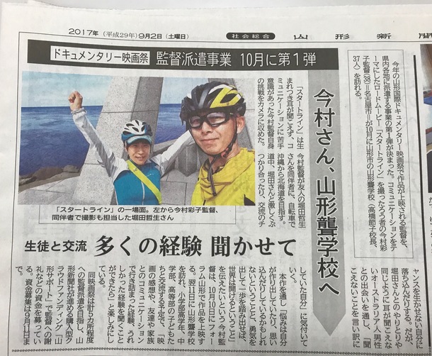 監督派遣の第一弾、映画監督今村彩子さんは、耳が聞こえません。そしてコミュニケイションが苦手。そんな彼女が自分を見つめ直すために選んだのは、沖縄から北海道の宗谷岬までの日本縦断自転車旅行!山形国際ドキュメンタリー映画祭ではこの映画を上映します。参加してくださる今村監督を、山形の聾学校に派遣し、聾者の先輩として生徒たちにいろんな体験を伝えていただき、一緒に語り合っていただくことになりました。そんな思いが、本日の山形新聞に掲載されました。ご覧下さいませ。そして実は、映画祭のボランティアの方が、今村監督と山形サイクリングミニツアーを楽しむ企画をただいま練ってくださってます。