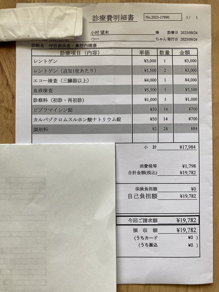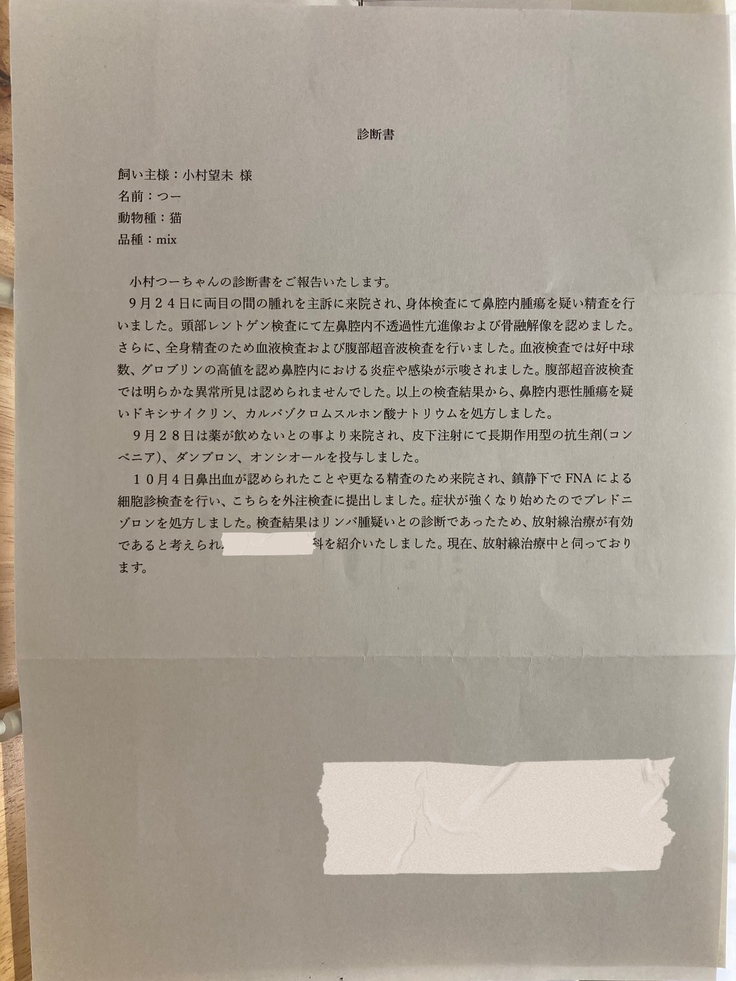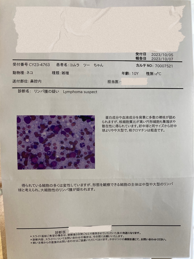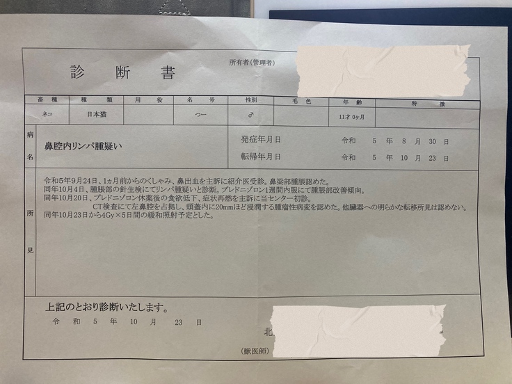 鼻腔内腫瘍の診断を受けたのは、2023年9月24日です。