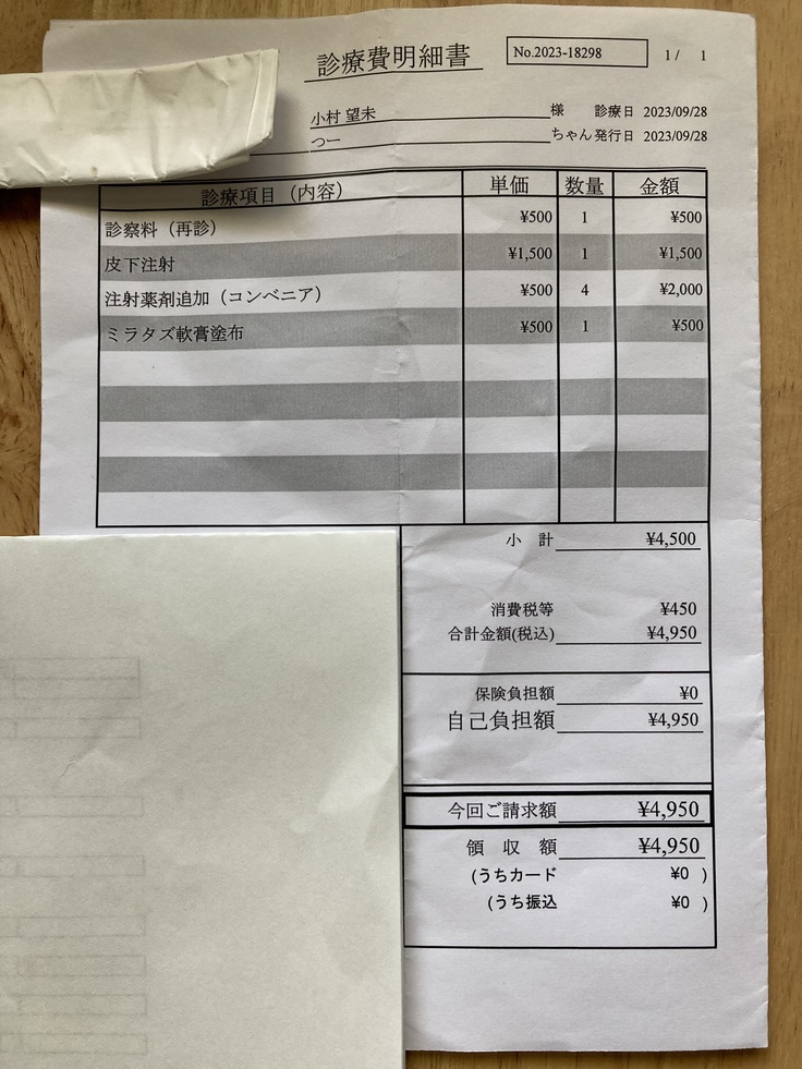 この日は、薬を飲ませるのが逆効果だということがわかったので、注射をしてもらい、鼻水なども出ているため、鼻の通りを良くする薬を耳に塗布してもらい帰宅することになりました