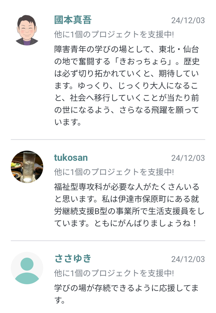 クラファンスタート初日、12月3日、全国各地からのご支援をいただきました。