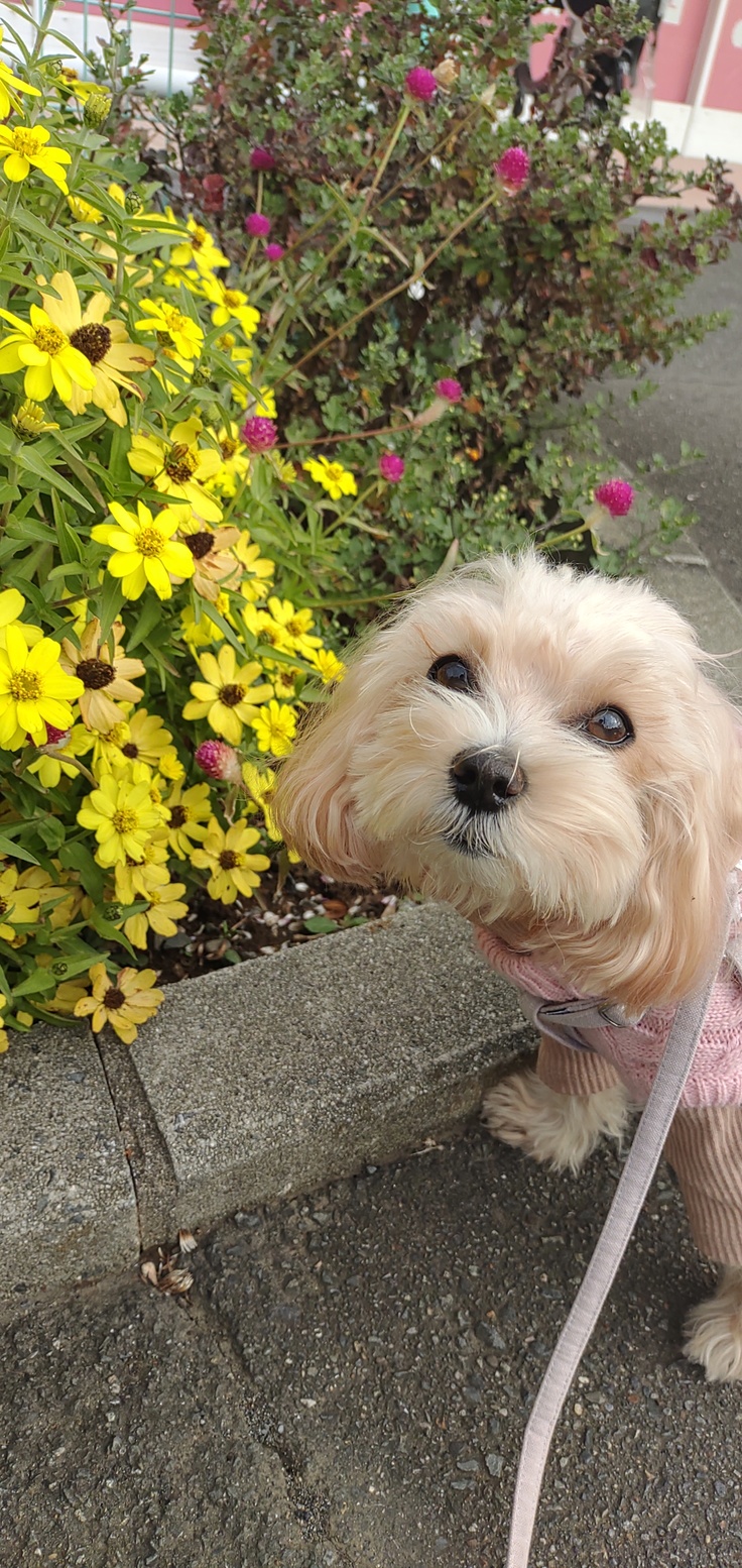 遊歩道に咲いている綺麗な薔薇を一緒に見たり🌹、ご近所のマルプー君にご挨拶をしたり、はじめましての猫に会ったりしました。