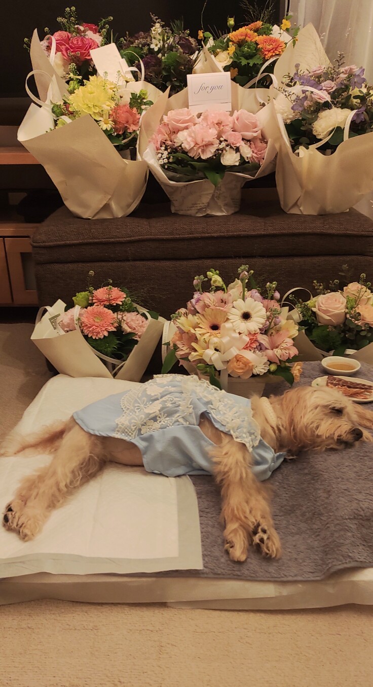 5歳を目前に4歳11ヶ月という短さで犬生に幕を閉じたラニーですが、皆様に沢山愛され沢山のお花に囲まれてとても穏やかな顔です。