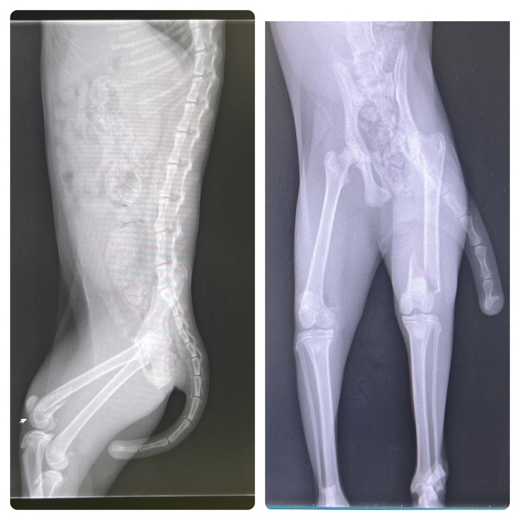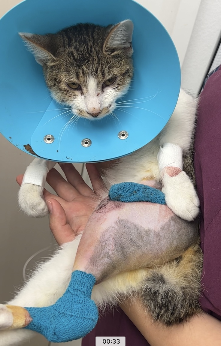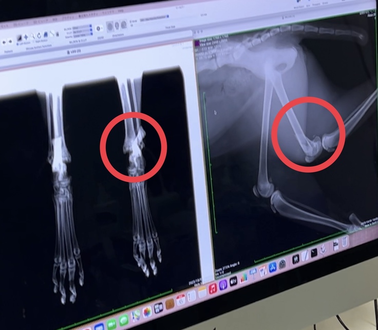 なんとか尊い子猫の命(推定7ヶ月)をつなぐことができたのですが、自力で立つことが出来ないのでレントゲンを撮ると左足の大腿骨と踵が骨折していると判明しました。
