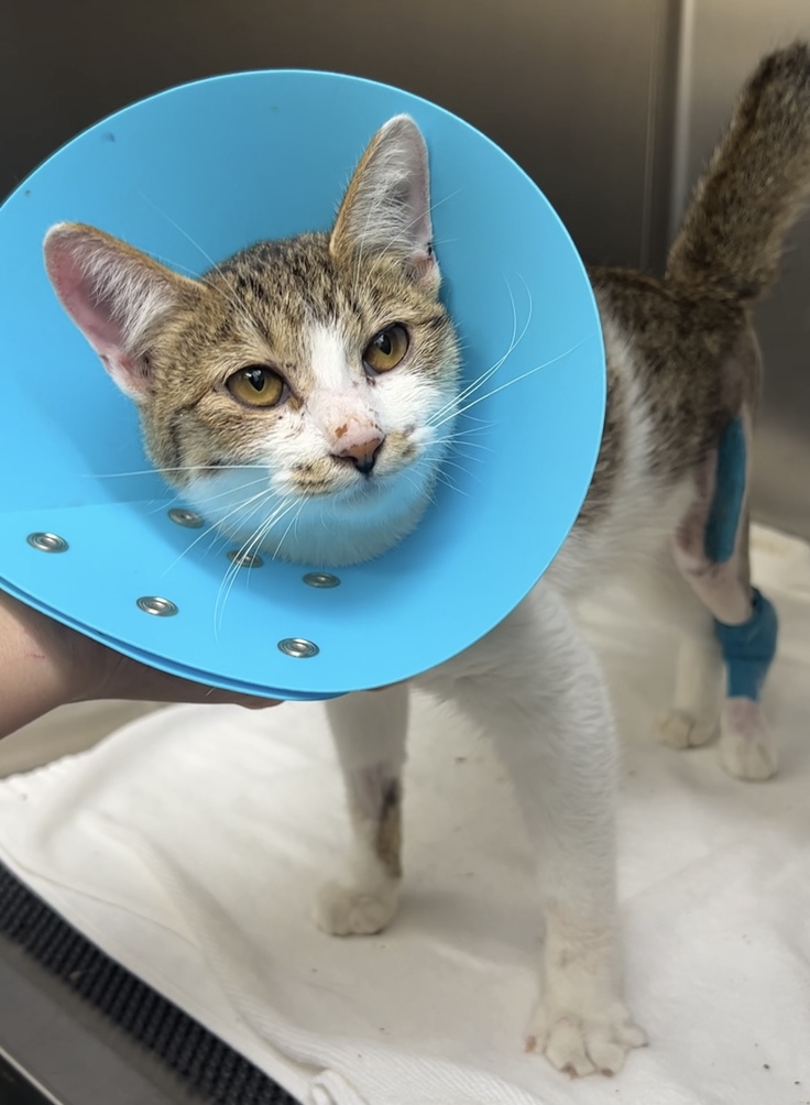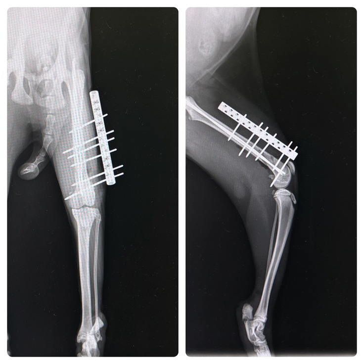 膝上と踵の重要な箇所が折れていて子猫なこともありまだ成長するので、整形外科を得意とする腕のある医師に診てもらった上で、