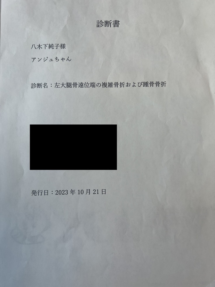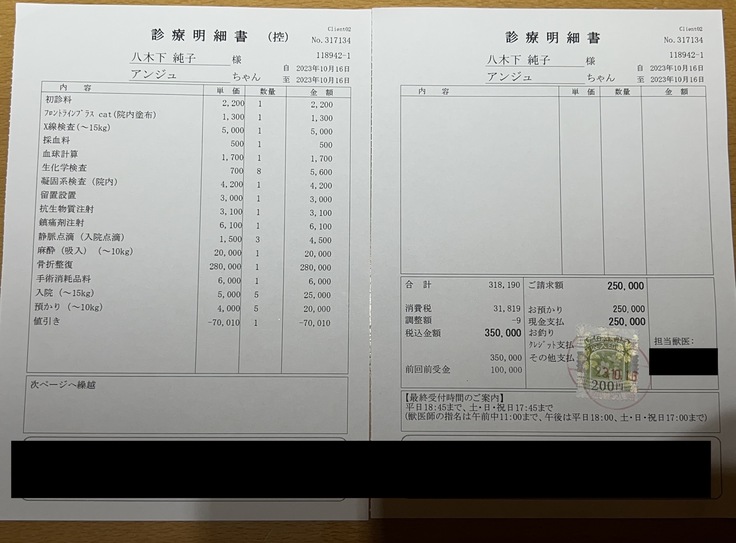 集まった資金はアンジュちゃんが事故に遭ってから退院までに支払った動物病院2件の治療費に充てさせていただきます。