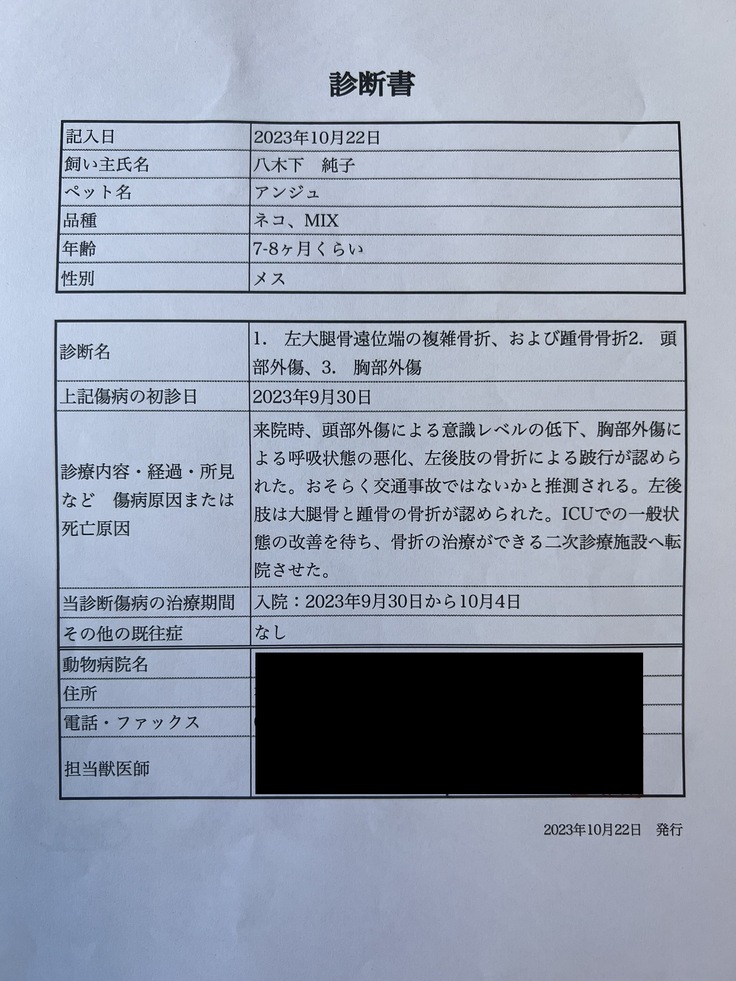 一命は取り留めたものの、骨折や脳への障害と後遺症もまだわからない状態だったため、愛護センターへは任せずに、