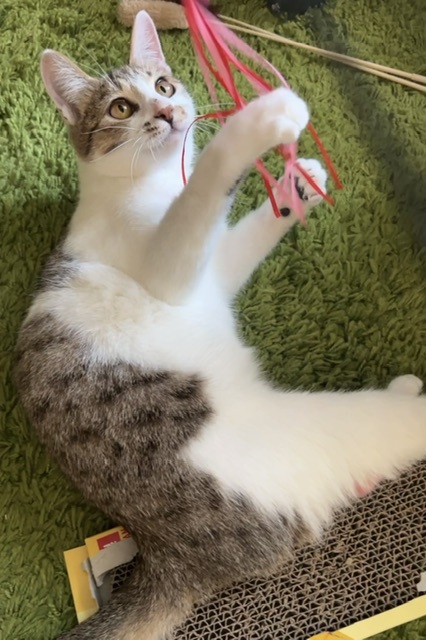 日に日に子猫らしい活発さも発揮しつつ、順調に回復していき、おもちゃを追いかけ回して飛んだり、突然走ってみたり、、