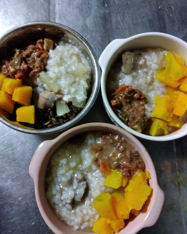この他に野菜やお肉のトッピング。 犬用オヤツをあげています。