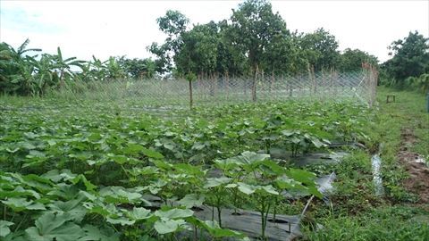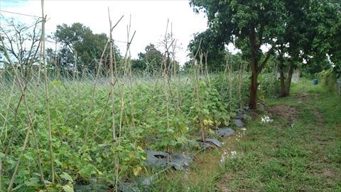 マンゴーの木の下の新しい畑は、これから改良が必要ですが、次第に良い畑になるでしょう、キュウリは何とか。オクラは順調。長ーいインゲンも順調。