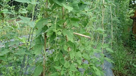 写真はキュウリとオクラ(右)、下はインゲン(ロングビーンズ)