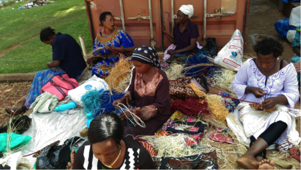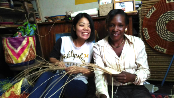 ウガンダで一緒にバスケットを作っている様子です。