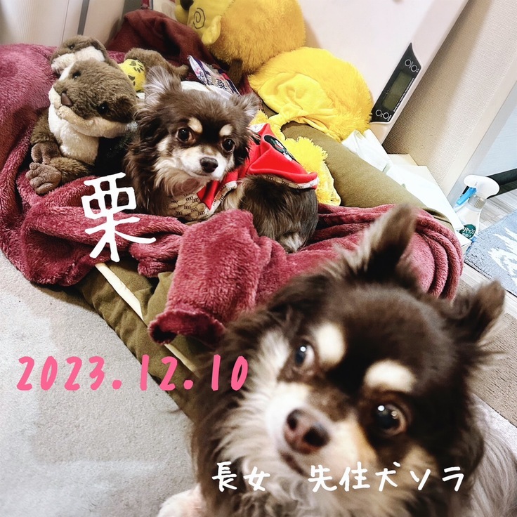 今は、秋に推定14歳で亡くなってしまった先住の繁殖引退保護犬、リズと同じ場所に栗が座っていて!びっくり驚きますが😳ゆっくり過ごしております♥️
