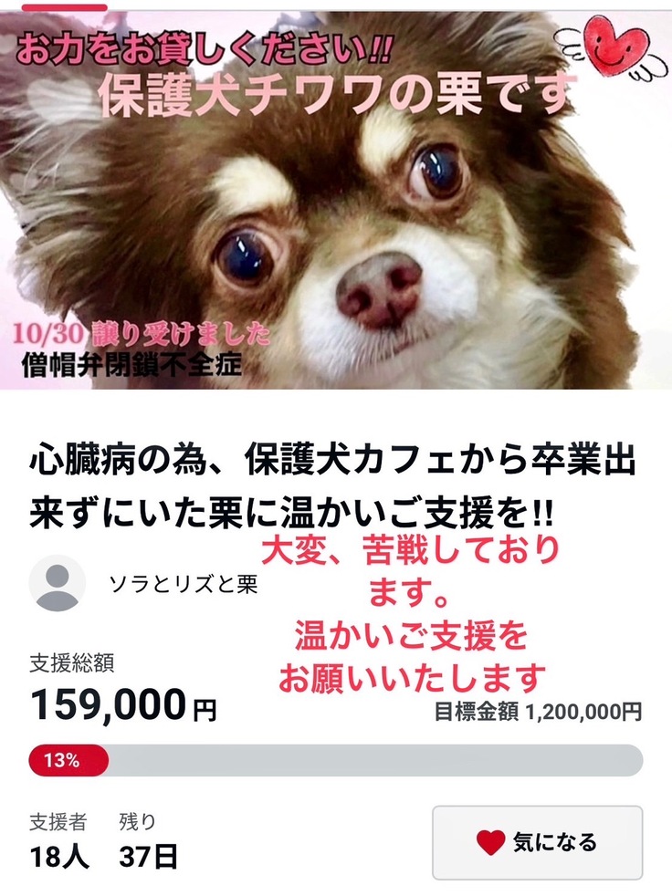 ❤️🔥クラウドファンディングでは、皆さまに今回の、200万円を越える僧帽弁閉鎖不全症の手術検査費用の、一部のご支援をお願いしております。どうか、よろしくお願いいたします🙇♀️