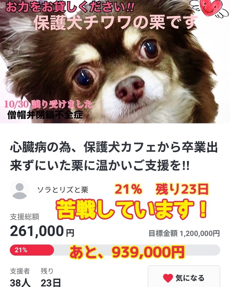 心臓病の栗を、保護犬カフェより命を最優先!として迎え入れました。11/19僧帽弁閉鎖不全症の手術を、自身の借し入れにより終えております。今後は術後検査、避妊手術からパテラ•ステージ3の治療まで予定しておりますが、全てが自費治療となっております。