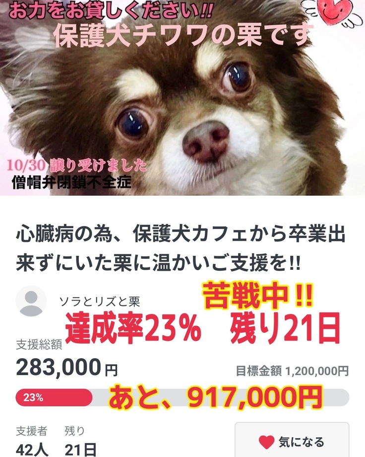 ♥️10/30心臓病の栗を、保護犬カフェより命を最優先!として迎え入れました。11/19僧帽弁閉鎖不全症の手術を、自身の借し入れにより終えております。今後は術後検査、避妊手術からパテラ•ステージ3の治療まで予定しておりますが、全てが自費治療となっております。