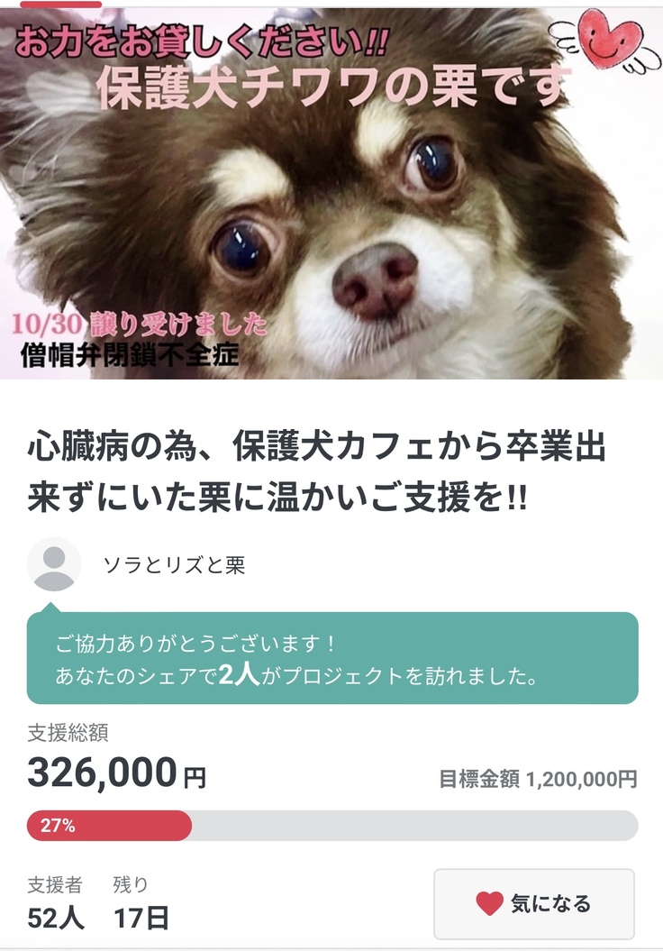 ♥️10/30心臓病の栗を、保護犬カフェより命を最優先!として迎え入れました。11/19僧帽弁閉鎖不全症の手術を、自身の借し入れにより終えております。今後は術後検査、避妊手術からパテラ•ステージ3の治療まで予定しておりますが、全てが自費治療となっております。
