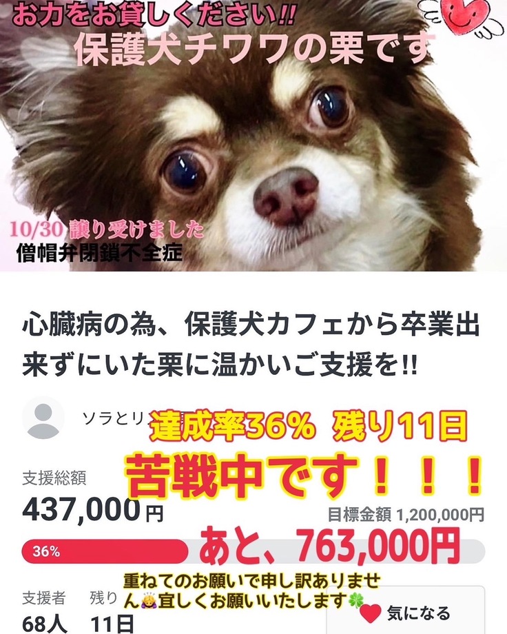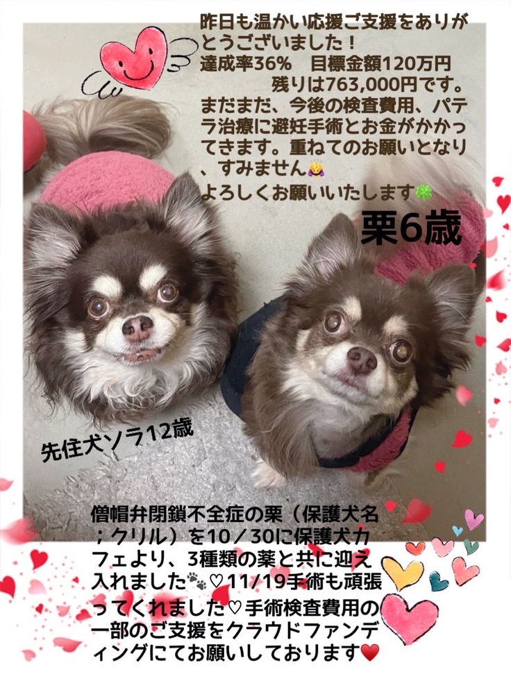 ♥️10/30心臓病の栗を、保護犬カフェより命を最優先!として迎え入れました。11/19僧帽弁閉鎖不全症の手術を、自身の借し入れにより終えております。今後は術後検査、避妊手術からパテラ•ステージ3の治療まで予定しておりますが、全てが自費治療となっております。